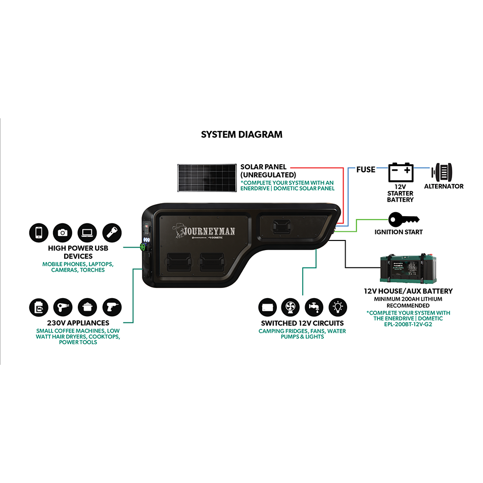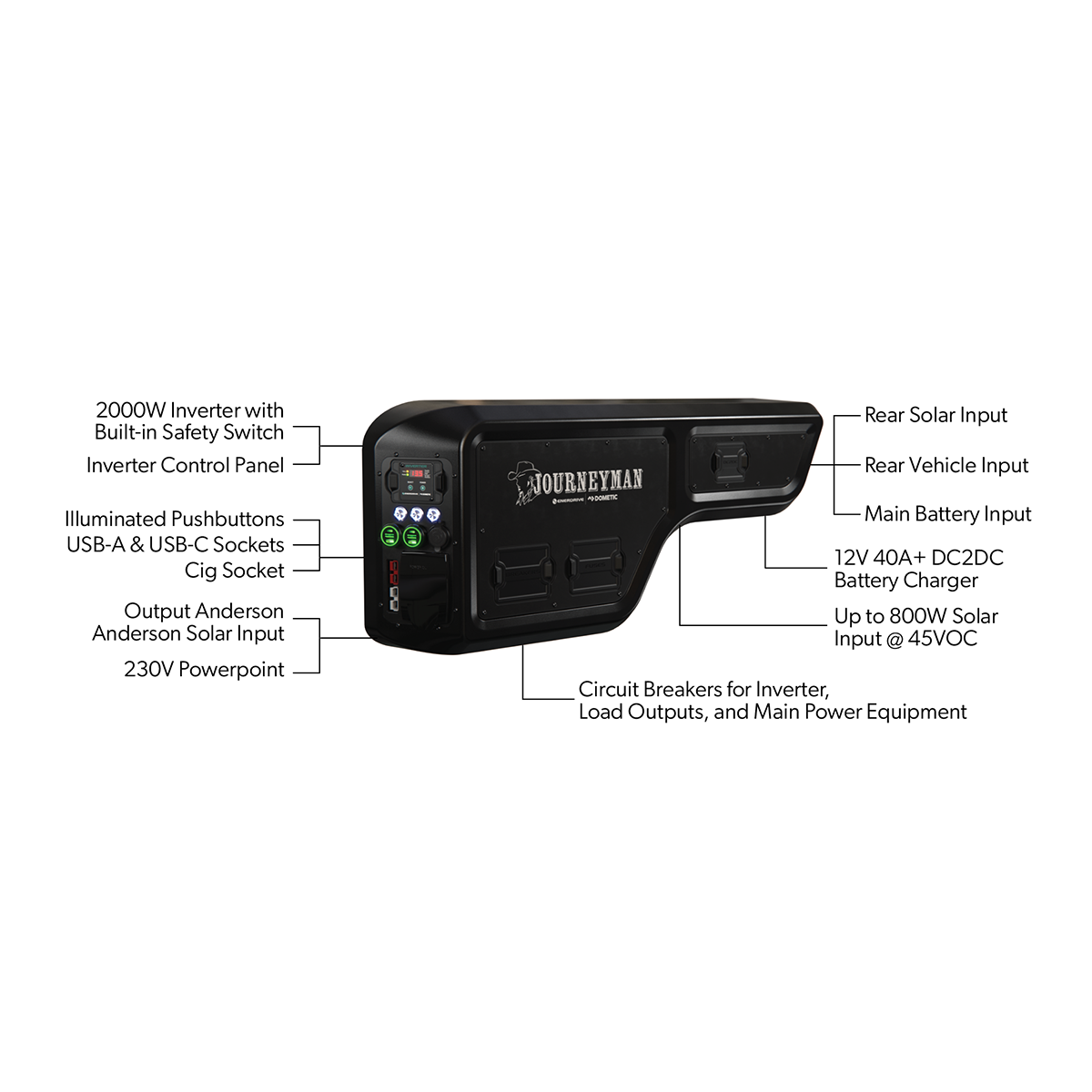 The Enerdrive | Dometic Journeyman has been specifically designed and engineered for ute tubs, providing everything you need to keep your gear powered whilst on the road or on the tracks! Featuring a 2000W Inverter and 40A+ DC2DC with MPPT to charge your battery whilst on the go, or from solar. The innovative design saves space and reduces install time and cabling.